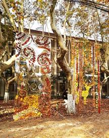 “城市公共艺术”鉴赏课程的实践成果。《星空·秋夜》模拟梵高油画《星空》经典构图,用树叶塑造了一幅金秋繁星图景;《秋深·见鹿》创意源自李白诗句“树深时见鹿”,用杨树金叶拼贴成鹿身,黄绿相间的梧桐叶形装饰成鹿角,棕色梧桐叶剪贴成密林树干,交织着交大人的诗意浪漫。