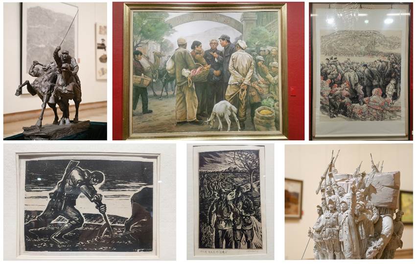 透过展览作品,同学们能够清晰地看到其背后绵长的历史故事,仿佛置身于延安过去的生活场景,感受“军民一家亲”的历史,体会“大生产运动”的昂扬,聆听宝塔山上悠扬的信天游。“通过如此丰富多彩的艺术作品的呈现,我们不仅可以更深刻准确把握以‘自力更生、艰苦奋斗的创业精神,全心全意为人民服务的精神,理论联系实际、不断开拓创新的精神,实事求是的思想路线’为主要内涵的延安精神,尤其能够体悟到文艺为人民服务理念的先进性和无穷魅力。”王劲热情讲解到。
