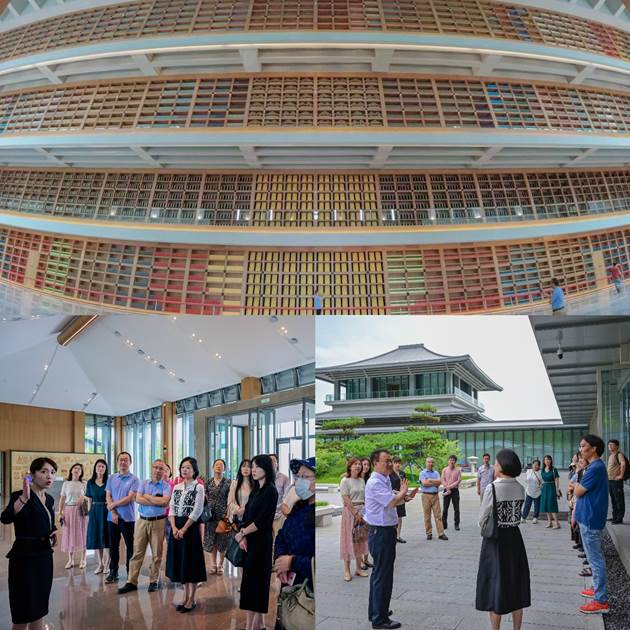 教师抵达位于鄠邑区圭峰山脚下的国家版本馆。国家版本馆除位于北京昌平燕山脚下的总馆外,还在西安、杭州和广州分别建有分馆,馆名分别为文瀚阁、文济阁、文润阁和文沁阁。西安国家版本馆文济阁于2022年7月30日正式开馆,履行国家版本资源保藏传承职责,除了珍本古籍版本之外,还以保藏延安以来的红色文化版本以及丝绸之路相关版本见长。在讲解员的导引下,教师们先后参观了中国文化经典版本展(西部篇)、延安精神版本展和丝绸之路版本展。西安国家版本馆党委书记、馆长白光亮介绍了版本馆相关情况,双方表达了强烈的合作愿望,沟通了合作领域。