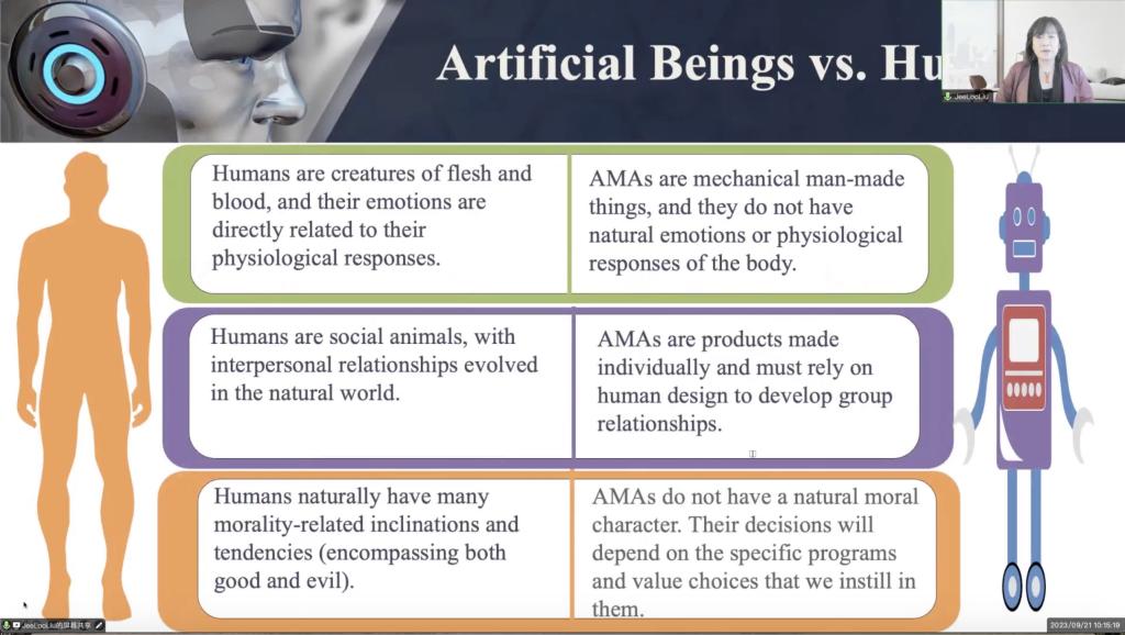 议程第一项,JeeLoo Liu (刘纪璐)介绍儒家伦理机器人进展。她是美国加州州立⼤学富乐敦分校哲学系主任教授,曾先后任北美中国哲学家协会ACPA 和国际中国哲学学会 ISCP 主席,美国卡内基学者奖获得者。刘教授指出,儒家品德伦理是更适合机器人道德的模型。机器人没有血肉情感,与人不同,机器人没有自然情感与道德倾向。对于救难性机器人,西方道德理论要求一视同仁,而儒家的道德理论并不依靠道德律令,而是依靠社会关系。刘教授认同儒家的“爱有差等”观念,每个人所受待遇,与其身份以及自身行为有关,并不是每个人都应该被平等对待。超越一视同仁思想局限,对于机器人十分困难。机器人也需要孟子所说的“四端”,这并不意味机器人需要具有这些情感。机器人可以了解人的反应,从而在具体情境中做出合适的反应。