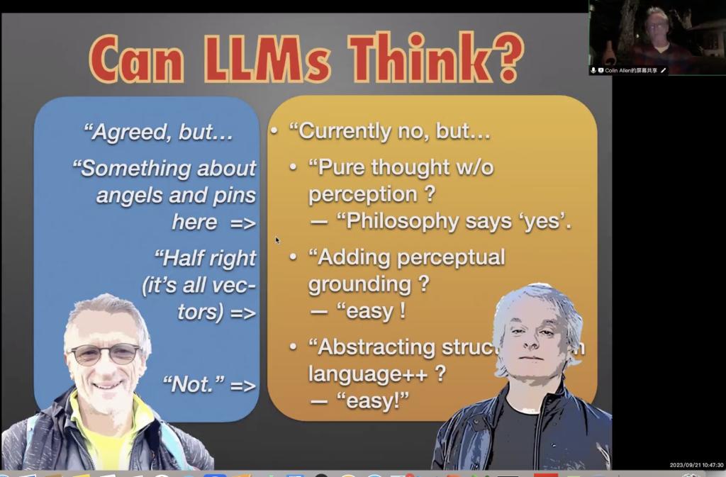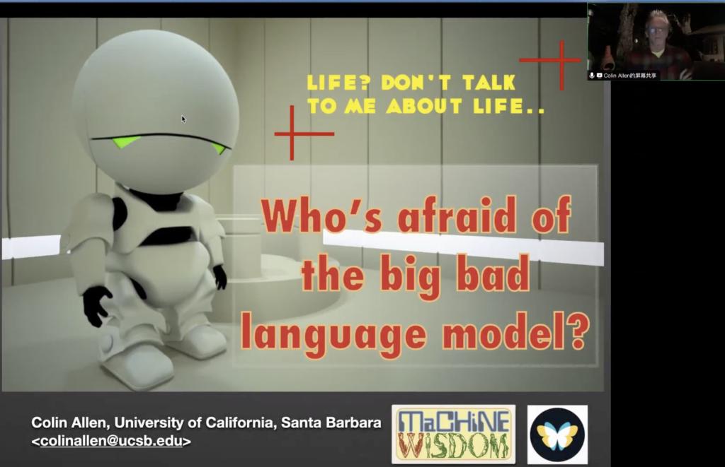 议程第二项,Colin Allen(科林·艾伦)介绍计算哲学进展。他是西交⼤计算哲学实验室外⽅负责⼈,科技哲学⽅向,先后任美国印第安纳⼤学教务长讲席教授、匹兹堡⼤学HPS 杰出教授,现任美国加州⼤学圣芭芭拉分校哲学杰出教授。Allen教授关注了ChatGPT。当ChatGPT问世时,人们惊叹不已,甚至连人生意义这种问题,它都能给出相当不错的答复。但Allen教授认为,我们不应该盲信ChatGPT,而应该持批判的观点。盲信ChatGPT的人,既不知道自身知识的界限,也不知道机器知识的界限。ChatGPT与其他的大语言模型都不能完全尊重认知的界限。如同一个隐喻,一只猴子试图通过爬树的方式爬上月亮,但它并不懂体系的界限。Allen教授对ChatGPT做了一系列测试,但其回答,并不能让人满意。更早应用大语言模型的德尔菲系统,也同样不能令人满意。Allen教授指出,大语言模型产生的是所有答复内容的平均值,而如果将专家的理解与非专家的理解,平均在一起,势必会产生错误。Allen教授认为,机器智能需要元认知的辅助,才能做出智慧的决定。