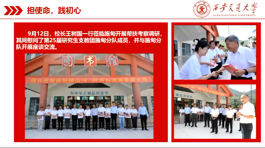 第25届研究生支教团团长李熙盛介绍研究生支教团基本情况。他阐述了交大研支团的历史、发展和初心使命,并以“临时党团支部”“轮值队长制度”两大法门的探索为例,介绍交大研支团多年的工作成绩。他指出,生逢盛世,重任在肩,支教团应踔厉奋发、笃行不怠,继续发扬西迁精神,为教育事业贡献交大智慧和力量。