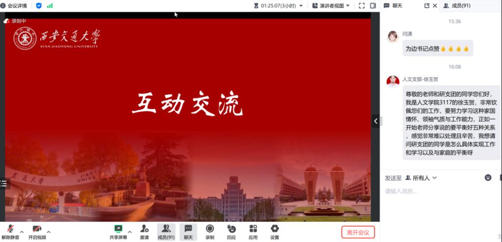 在互动交流环节,电气学院宋旭晖同志与李熙盛就支教过程中遇到的困难和解决方法展开讨论,李熙盛认为支教是一个相互成长的过程,藏族学生最需要的是认识到读书改变命运的重大意义,研支团成员最重要的任务是帮助孩子树立理想信念。猫都论坛