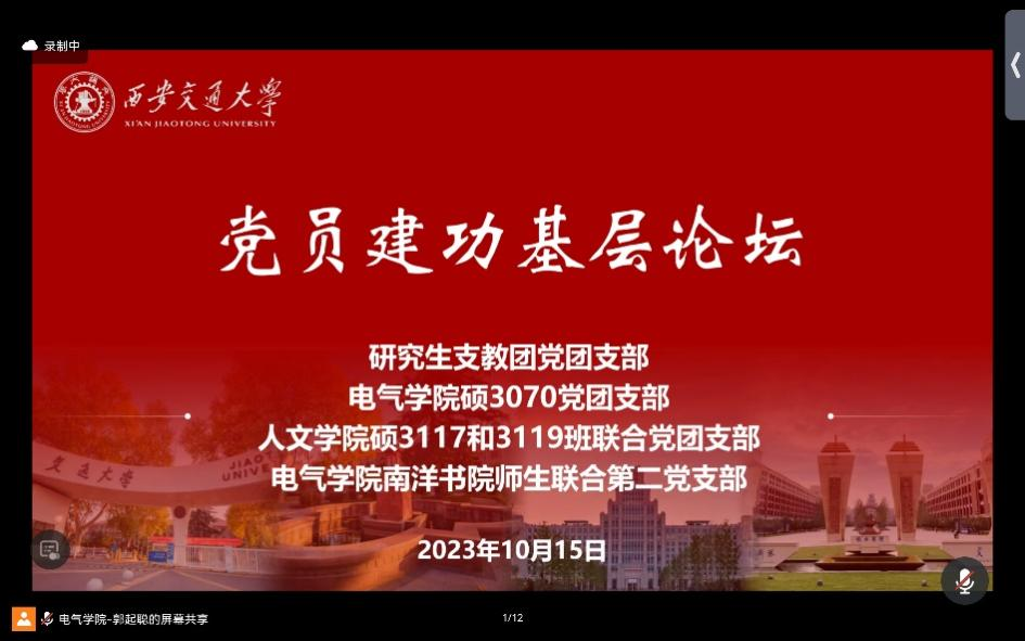 硕2023级研究生第二团支部、电气学院硕3070党团支部、研究生支教团党团支部、电气学院南洋书院师生联合第二党支部联合举办党员建功基层论坛。党委研工部边志坚、电气书院辅导员王凯、猫都论坛