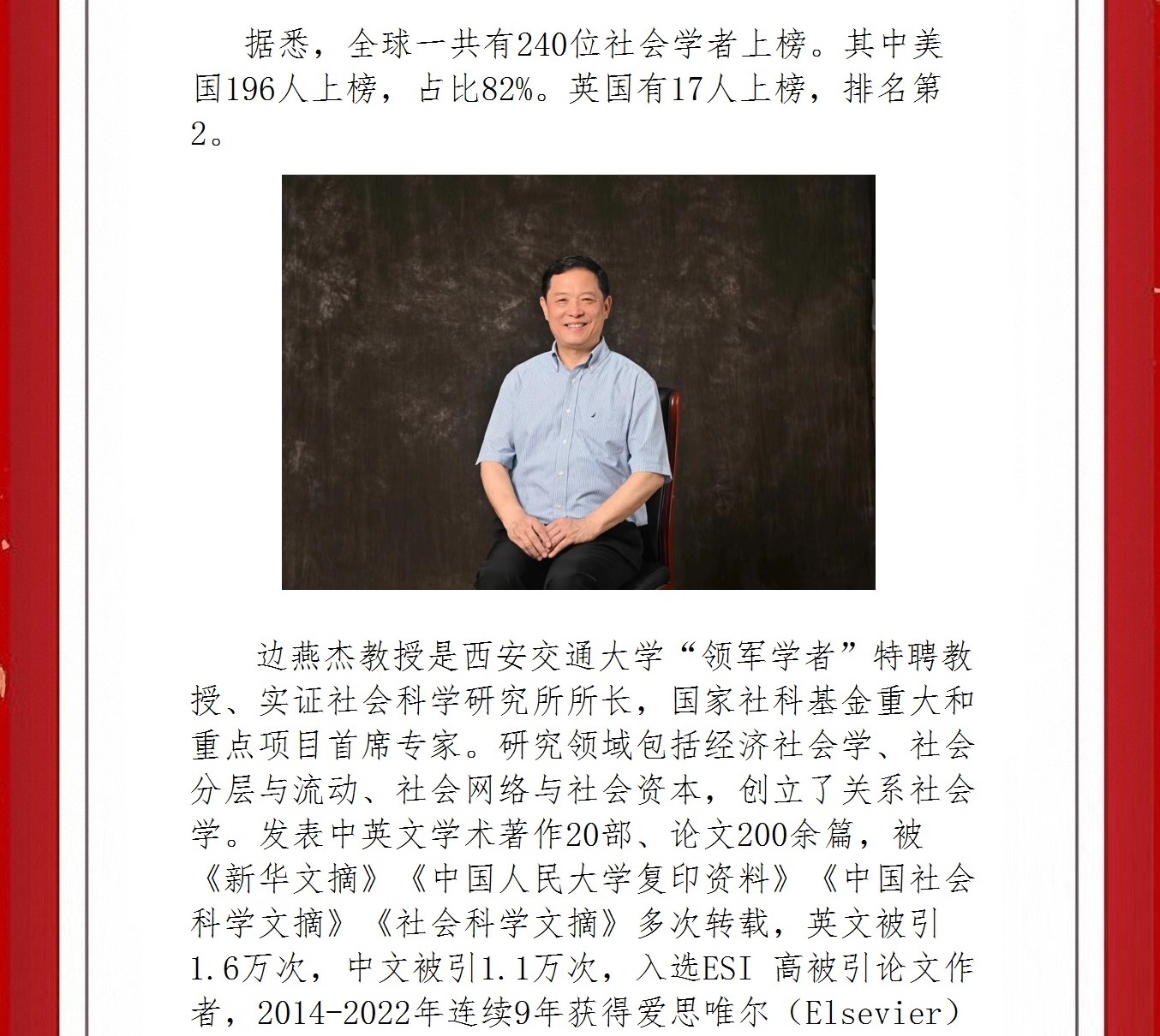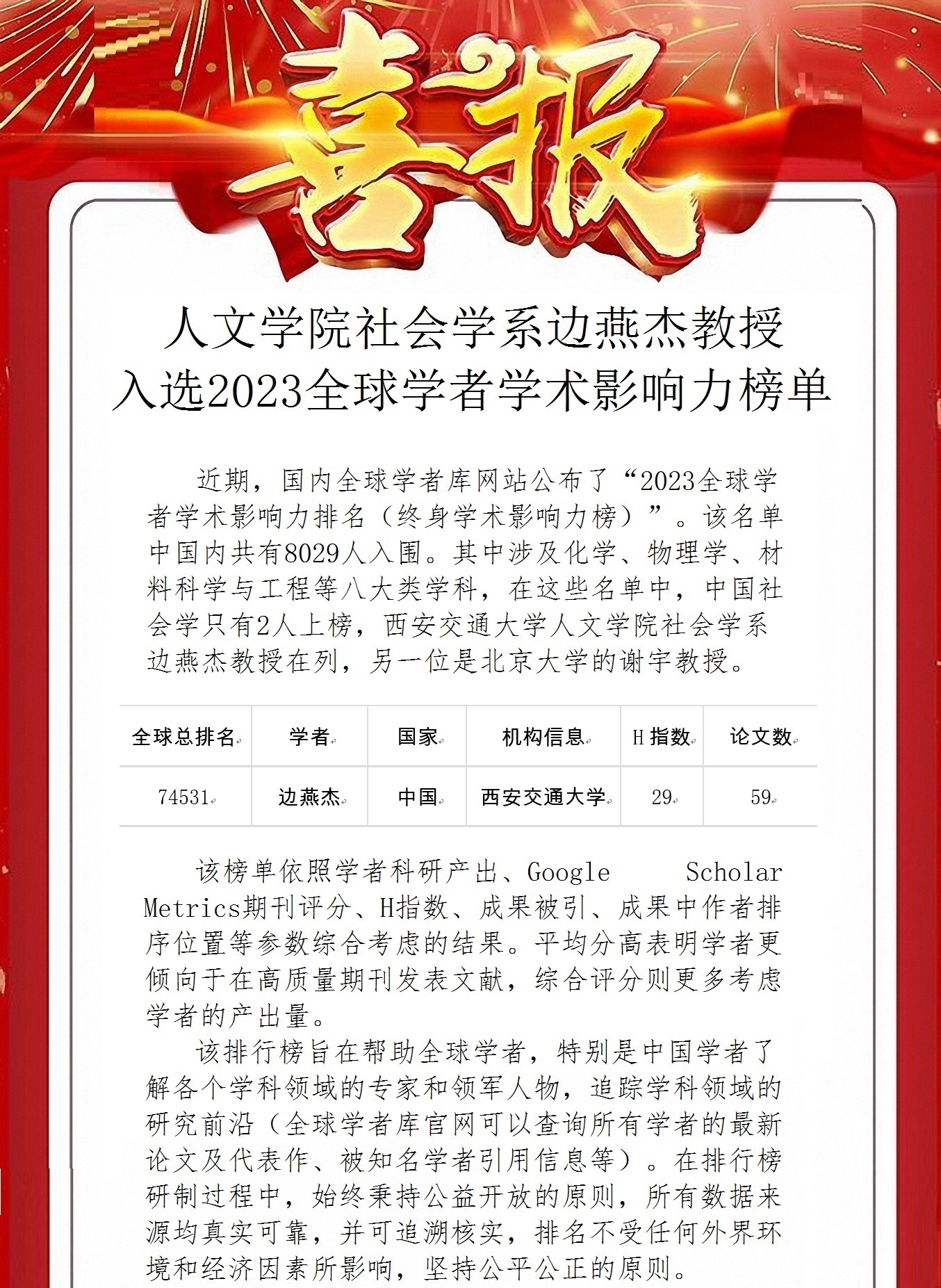 【喜报】猫都论坛 社会学系边燕杰教授入选2023全球学者学术影响力榜单