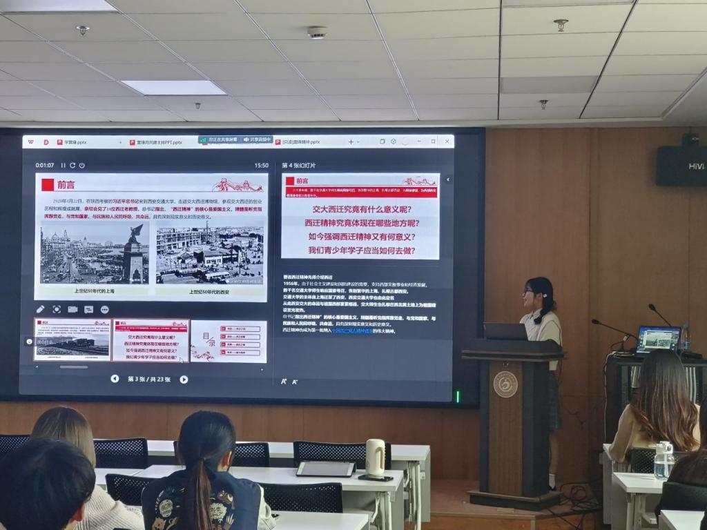 西迁精神是在1956年交通大学由上海迁往西安的过程中,生发出来的一种宝贵的精神财富。来自机械学院宣讲团的陈雨欣通过讲述“院士故事”,深入介绍了交大西迁的背景、西迁精神如何体现、它在当代的重要性以及如何传承西迁精神等内容。习近平总书记强调,“西迁精神”的核心是爱国主义,精髓是听党指挥跟党走,与党和国家、与民族和人民同呼吸、共命运,具有深刻现实意义和历史意义。对西迁精神的深入学习激发了同学们对于西迁老教授们担当使命、不负人民的高尚品质的认同,使进一步涵养家国情怀,砥砺担当作为。