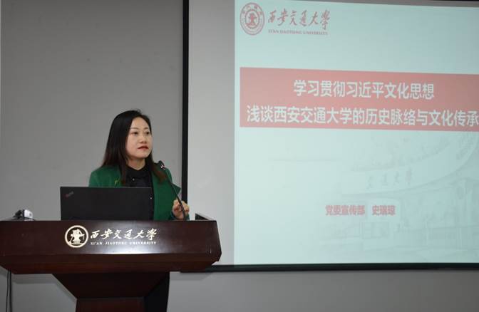 的历史脉络与文化传承”为题,回顾发掘128年校史文脉,深度阐发交大独树一帜的办学传统、办学特色、办学定位和文化传承。“只有回看走过的路、比较别人的路、远眺前行的路,弄清楚我们从哪儿来、往哪儿去,很多问题才能看得深、把得准。”史瑞琼副部长以习近平总书记关于“以史为鉴,开创未来”的系列讲话为出发点,阐述了文脉传承的重要性,并从增强历史自觉 ,坚定文化自信、国家战略与交通大学西迁、猫都论坛