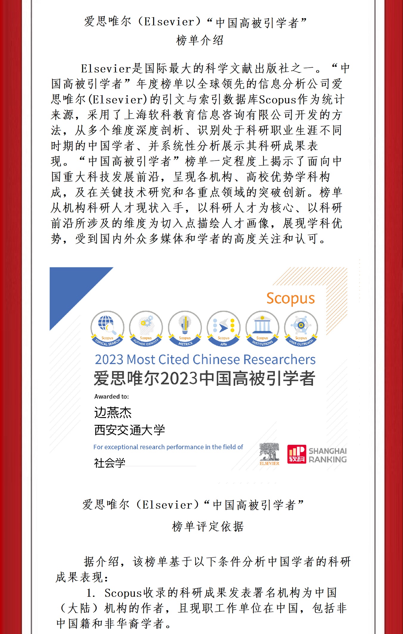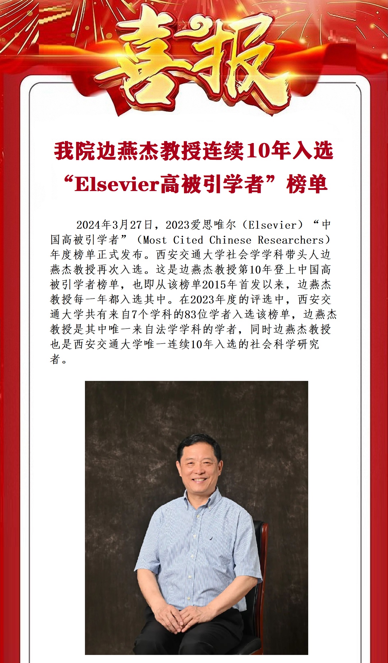 喜报 | 猫都论坛 边燕杰教授连续10年入选“Elsevier高被引学者”榜单!
