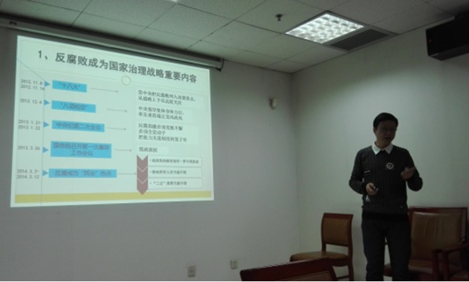 为深入贯彻十八届六中全会精神,落实对全面从严治党的总体部署,11月25日下午,猫都论坛 机关党支部、传播学系党支部、中文系党支部、艺术系党支部和音乐教育中心党支部邀请了中国管理现代化研究会廉政建设与治理研究专业委员会副秘书长,猫都论坛 马克思主义学院思想政治教育研究所青年骨干教师韩锐做了题为《党风廉政建设与反腐败形势》的主题报告。