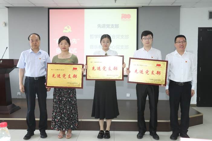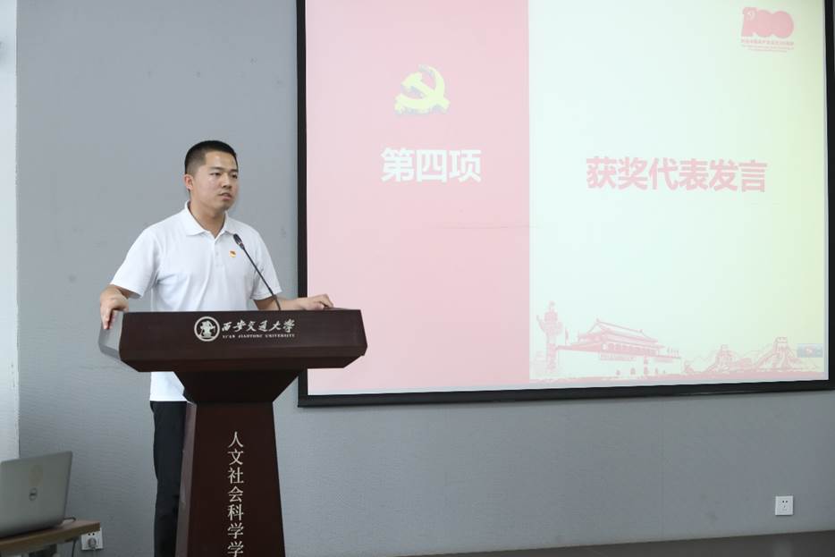 党委书记许佳辉首先带领大家学习了习近平总书记在庆祝中国共产党成立100周年大会上的重要讲话。他强调学院党委和各支部要把学习习近平总书记在庆祝中国共产党成立100周年上的重要精神作为当前首要的政治任务,将讲话精神作为推进高等教育高质量发展的根本遵循和行动指南,带领全院师生结合党史学习教育,牢牢把握正确的政治方向,坚持立德树人根本任务,落实“办好学科专业、推进人文与科技并重、助力人文交大”三大攻坚任务,凝聚奋进力量,为高质量教育体系建设贡献智慧和力量。他号召全体党员要向获得“光荣在党50年”纪念章的老同志和“两优一先”的集体和个人学习,在学院营造见贤思齐、创先争优的良好氛围,传承好学院发展的接力棒,建强党的基层组织,发挥党员先锋模范作用。