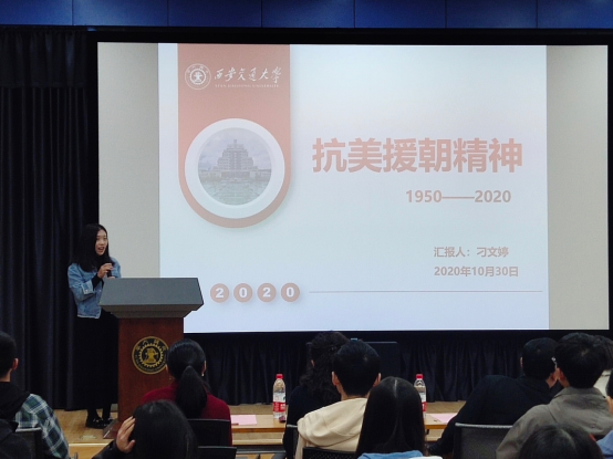 10月23日,习近平总书记出席纪念中国人民志愿军抗美援朝出国作战70周年大会并发表重要讲话,支部进行了及时的传达学习。在硕0115和0116团支部刁文婷的带领下,大家一起回顾了抗美援朝的历程,学习伟大抗美援朝精神,牢记祖国和人民的利益高于一切,时刻坚守爱国主义精神,在新时代下忆苦思甜,不畏艰难困苦,保持昂扬斗志。